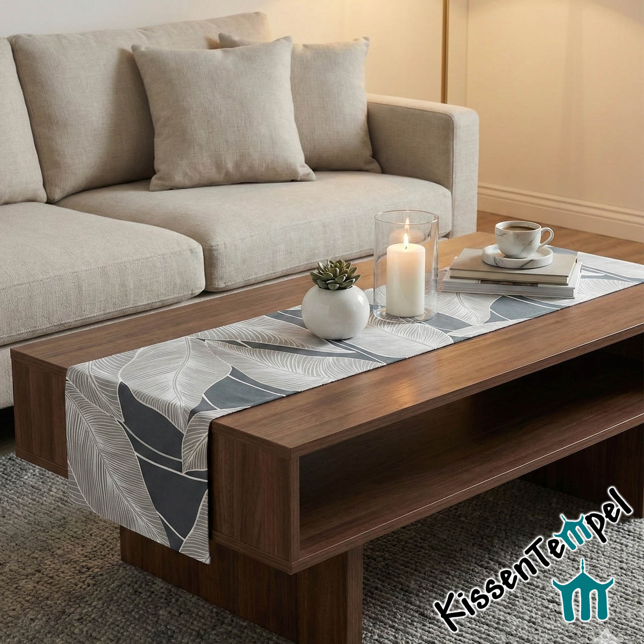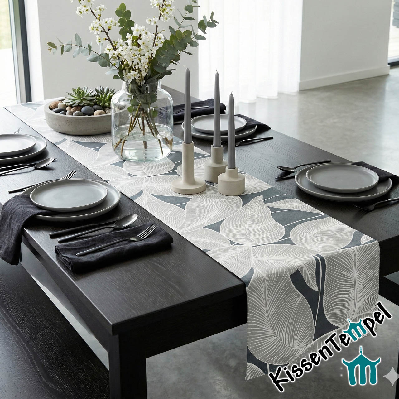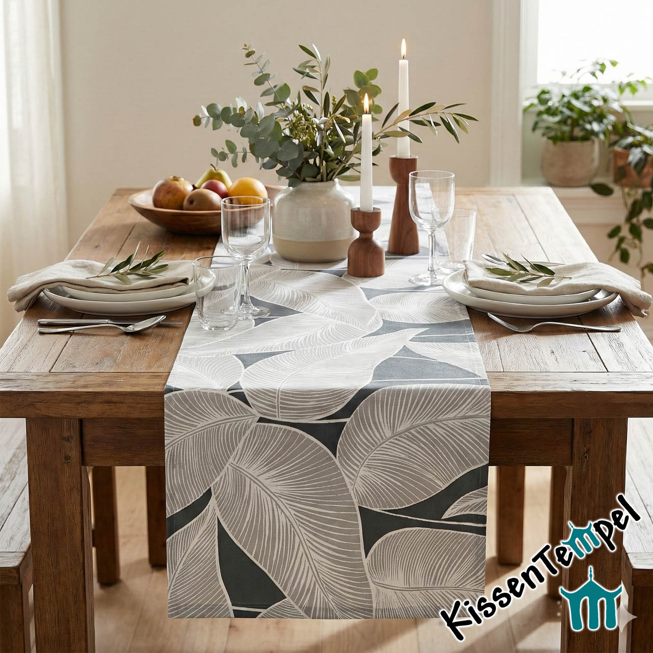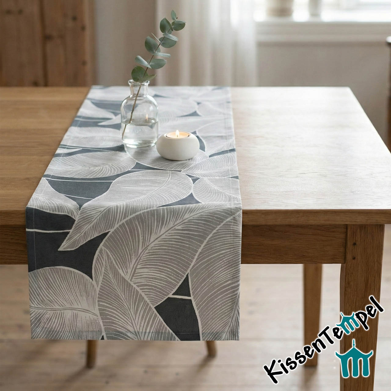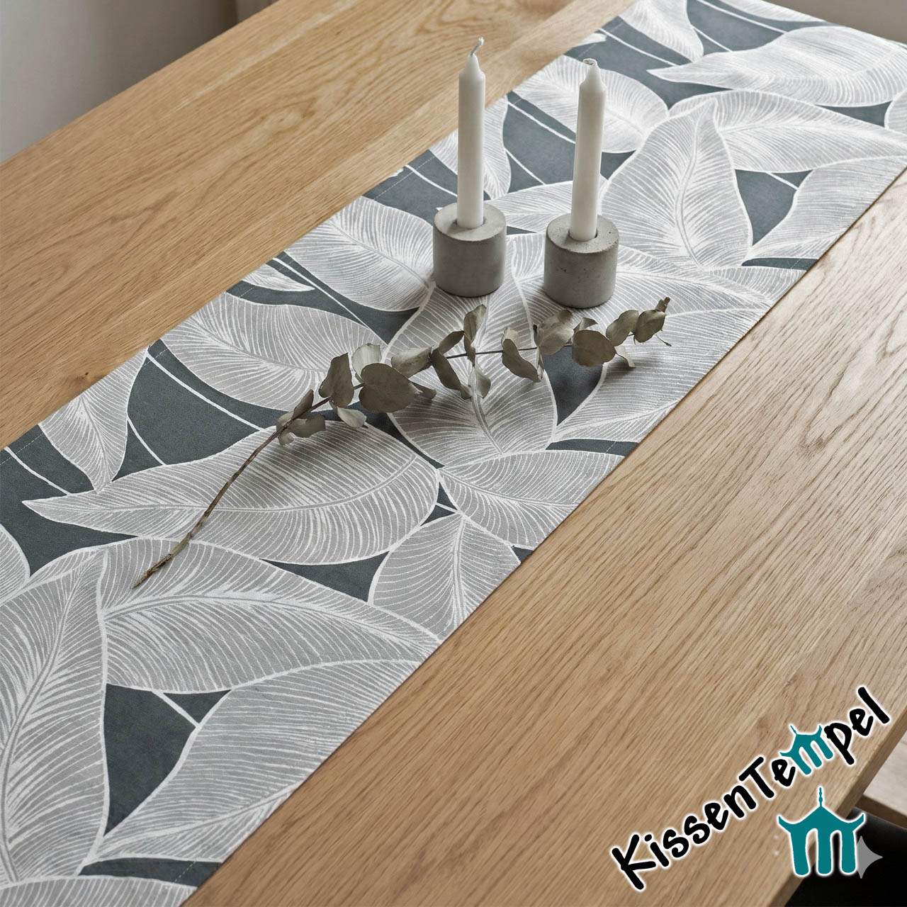 🟠 Auf Anfrage fertigen wir den Tischläufer gerne auch mit anderen Maßen. Anfrage - Motiv: Großes Blättermotiv / Tropische Blätter