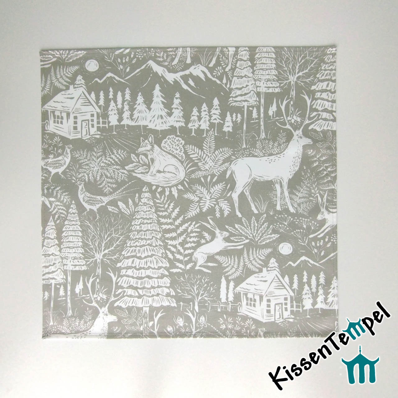 - Motiv: Landschaft mit Berge, Waldhütte, Tannen, Farne und Waldtiere (Hirsch, Fuchs, Hase)