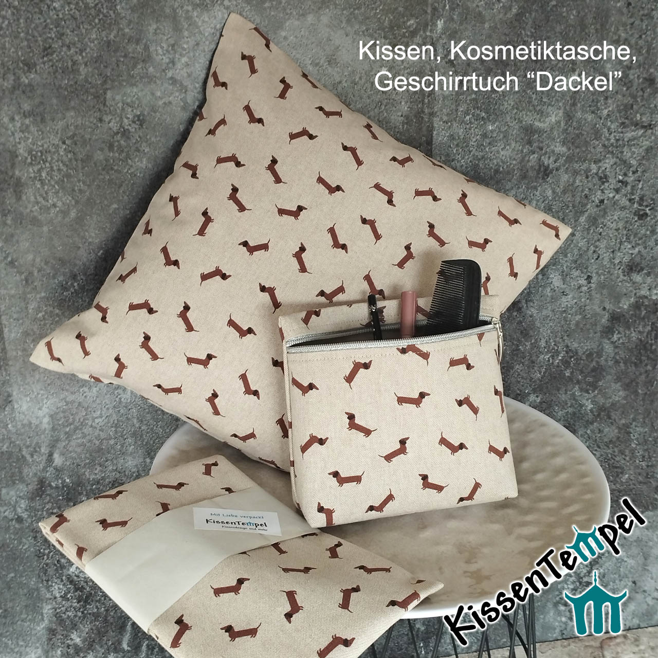 - Motiv: niedliche kleine Dackelmotive auf natur/mittelbraunem Hintergrund
