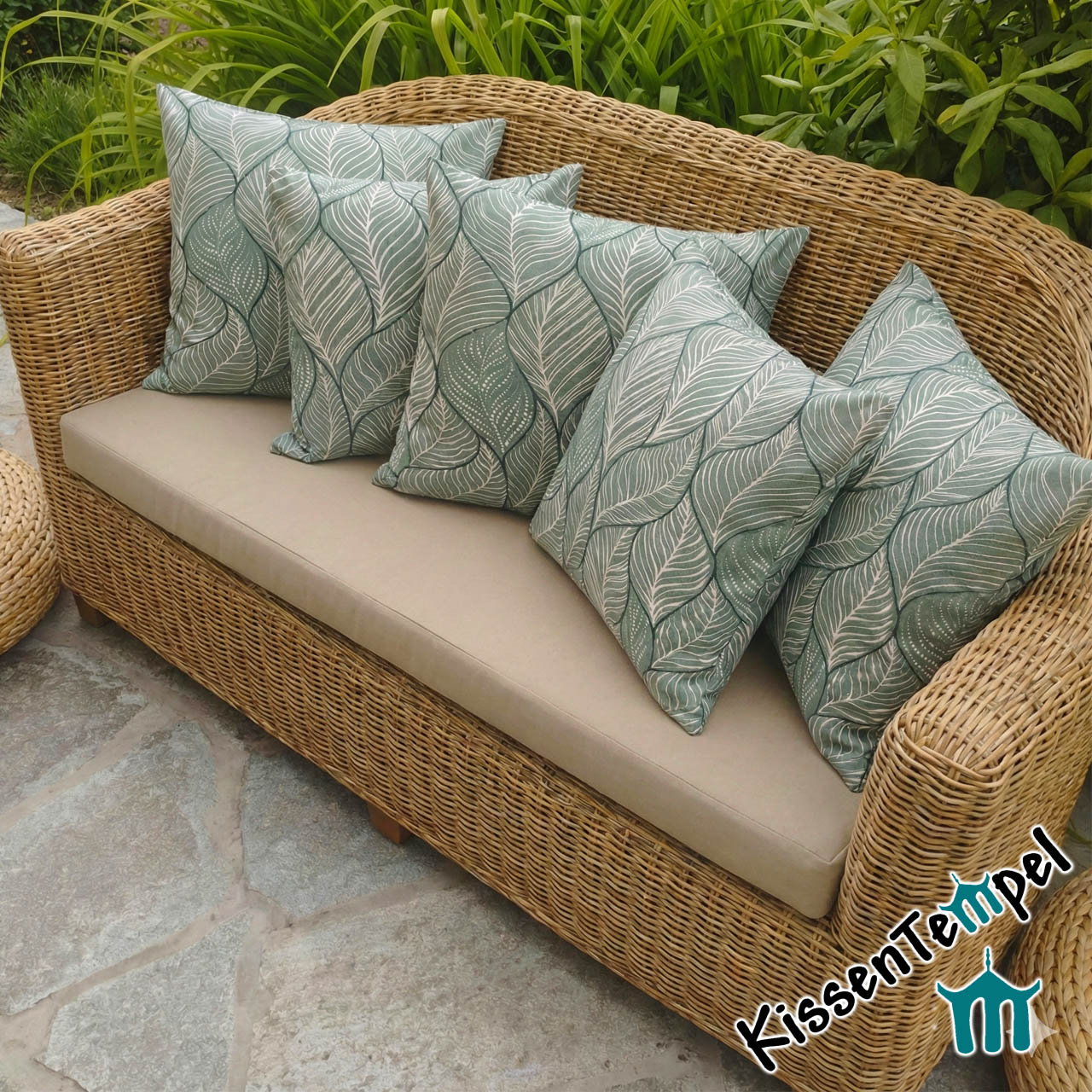 Der KissenBezug zeigt ein Muster aus salbeifarbene Blättern, die sich harmonisch aneinanderreihen.