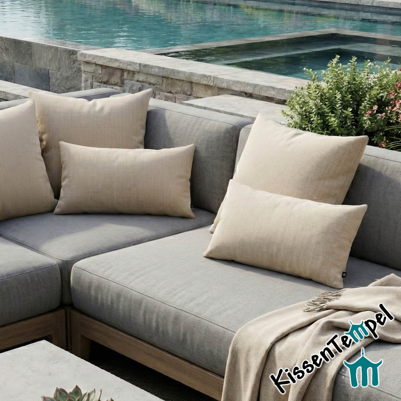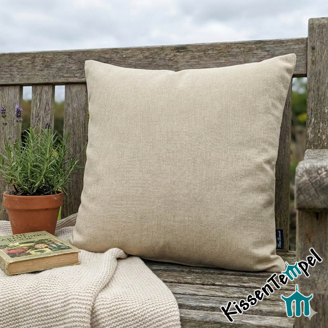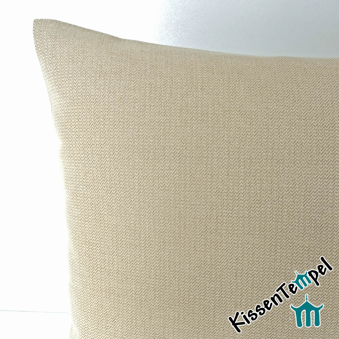 Edle Optik: Die feine Fischgrat-Struktur (Herringbone) verleiht dem beigen Stoff eine Tiefe und Wertigkeit, die man bei gewöhnlichen Outdoor-Kissen selten findet.