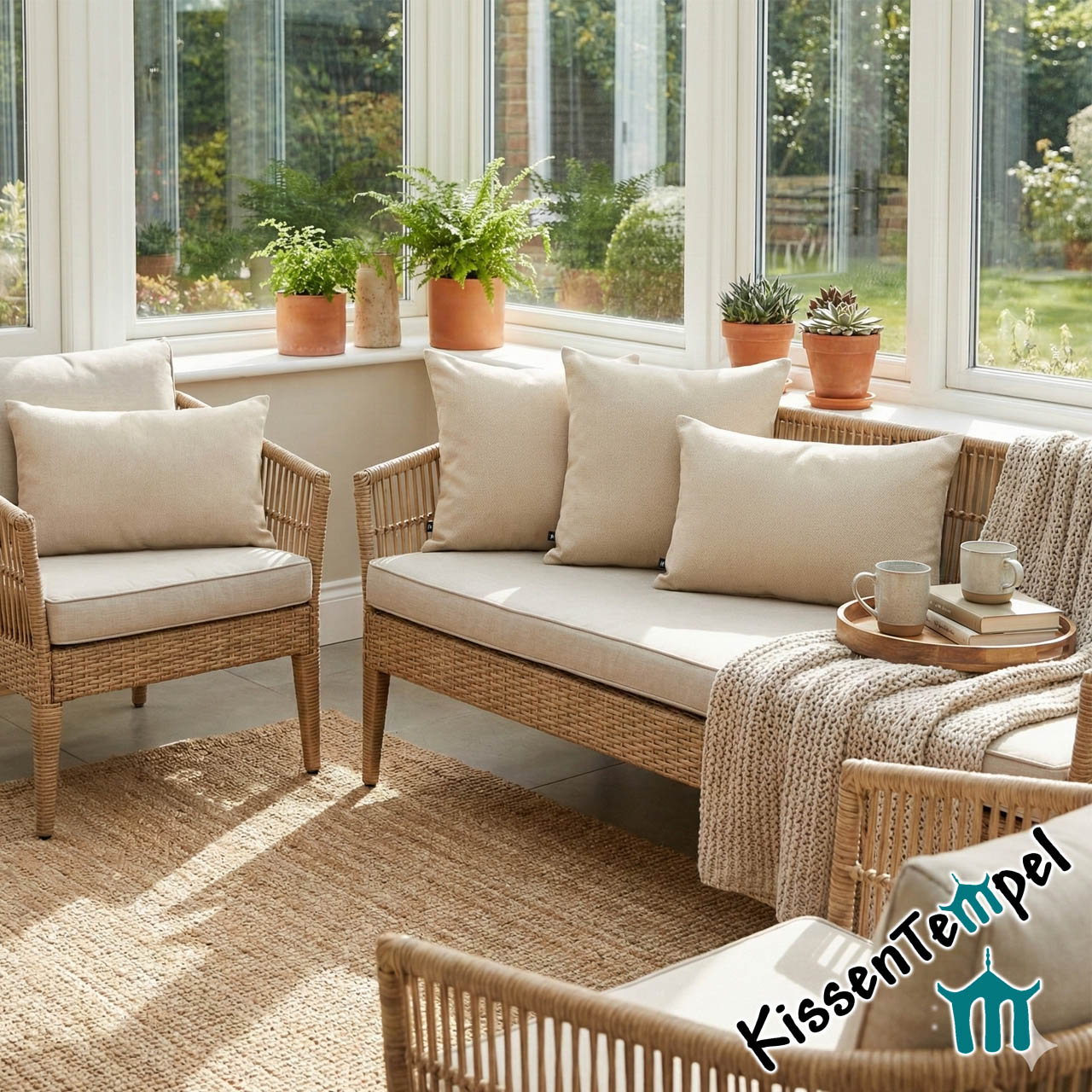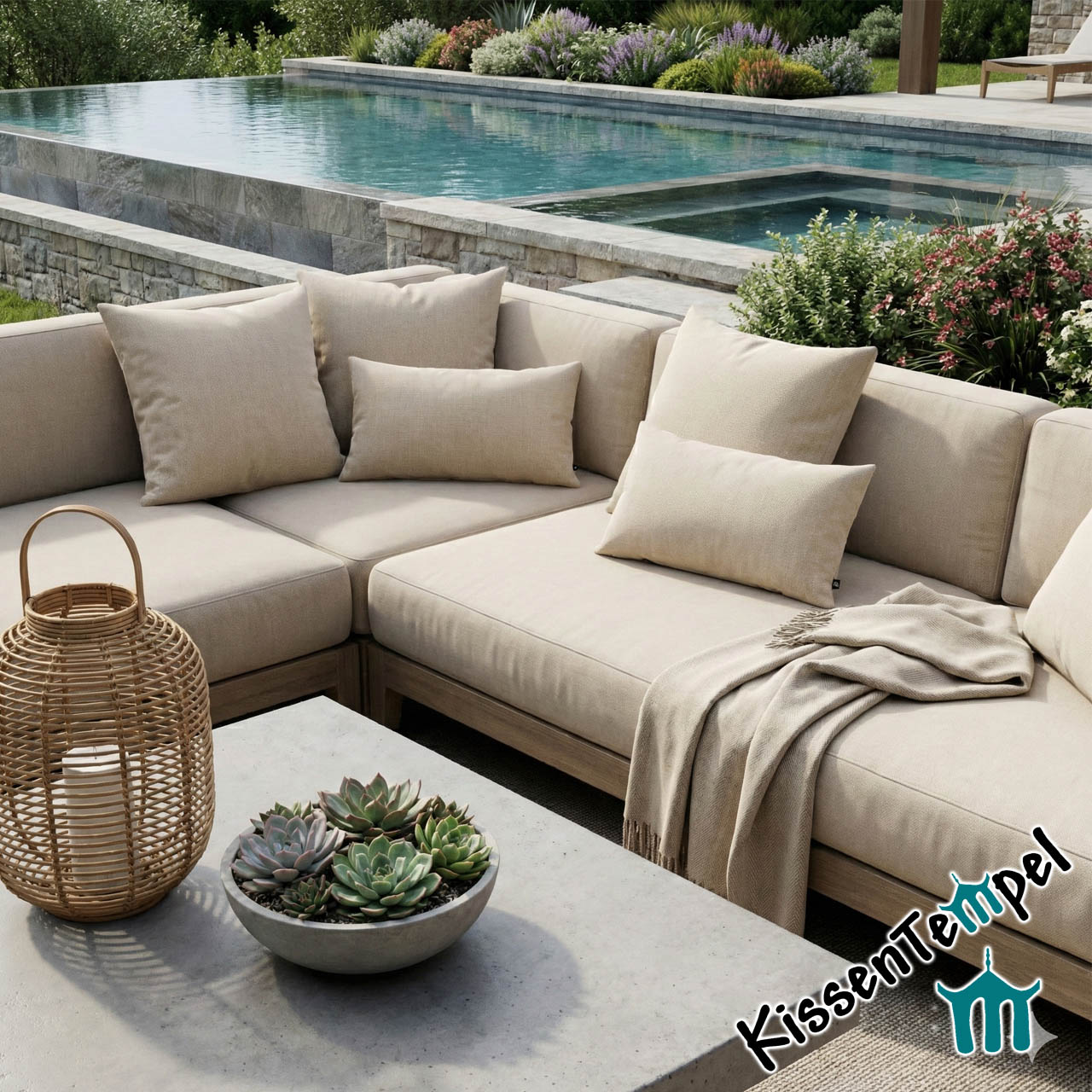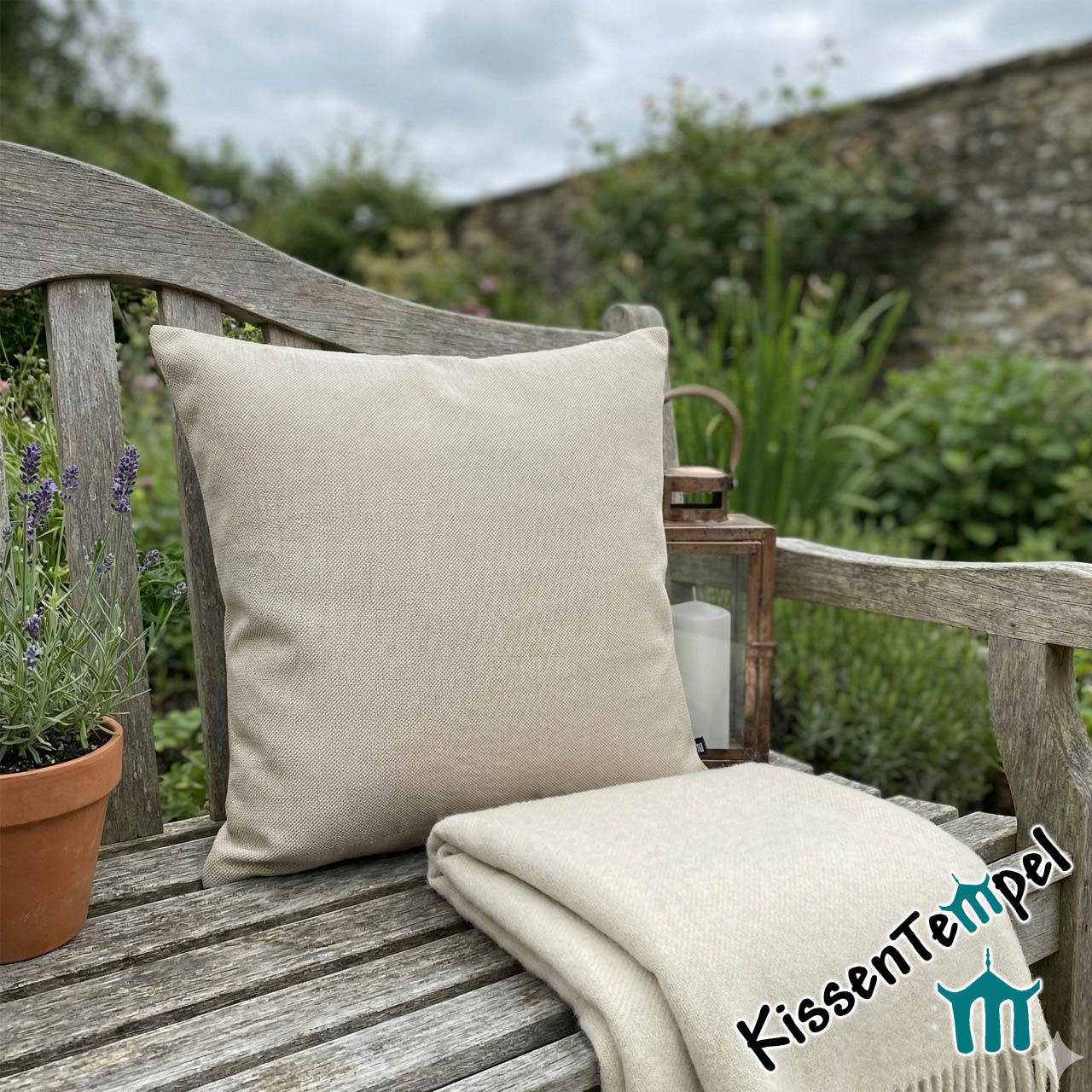 Edle Optik: Die feine Fischgrat-Struktur (Herringbone) verleiht dem beigen Stoff eine Tiefe und Wertigkeit, die man bei gewöhnlichen Outdoor-Kissen selten findet.